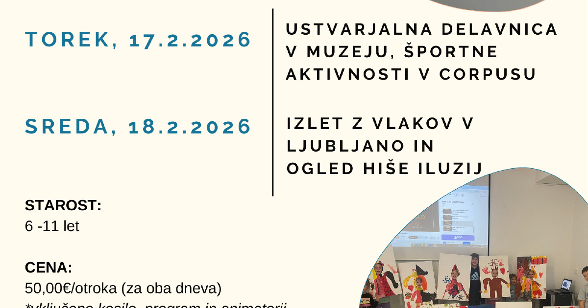 Vabimo vas na zimski program za otroke, poimenovan KULTUR-Švic! V času zimskih počitnic ga bomo izvedli kar dvakrat; 17. in 18. februarja 2026! V torek, 17. 2.2026, bomo z otroci kulturno ustvarjanje v muzeju dopolnili s športnimi aktivnostmi v centru Corpus. Naslednji dan, v sredo, 18.2.2026, pa se bomo odpravili na pustolovščino z vlakom: obiskali bomo Hišo iluzij!