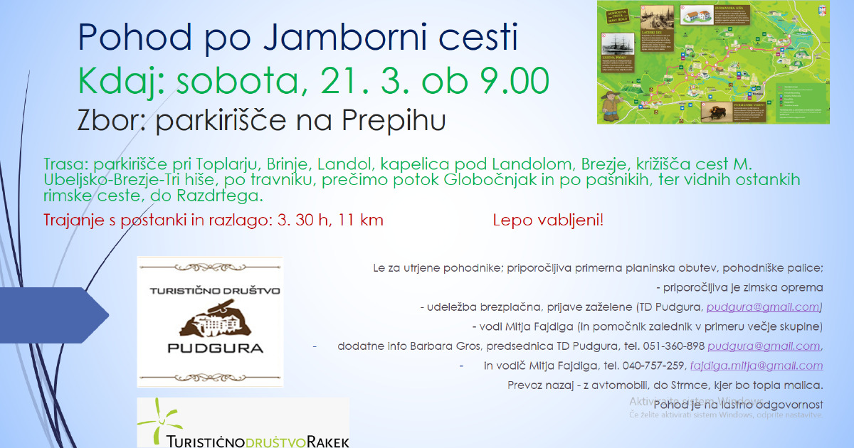 Pohod po Jamborni poti od Prepiha do Razdrtega. Trasa: parkirišče pri Toplarju, do Brinja, po cesti do Landolu, do Brezja, od križišča cest M. Ubeljsko-Brezje-Tri hiše po travniku, prečimo potok Globočnjak in po pašnikih do Razdrtega. Trajanje s postanki in razlago: 3. 30 h, 11 km • le za utrjene pohodnike; potrebna je ustrezna obutev in obleka, priporočene pohodne palice Vodi Mitja Fajdiga Malica bo v Strmci.