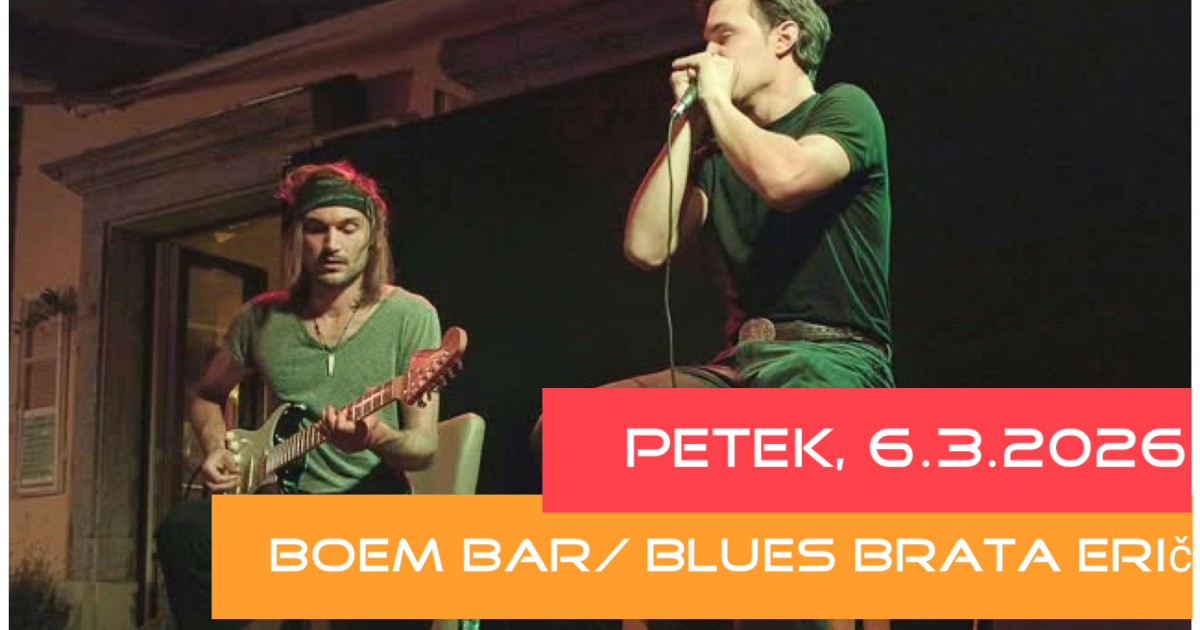 Dodaj v koledar! 2026-03-06 21:00:00 2026-03-06 23:00 Europe/Ljubljana Blues brata Erič / rock'n'roll energija, blues ritmi in poskočen country Miha in Julijan Erič – virtuozna brata, ki sta svojo glasbeno pot začela že v zibelki, vabita na večer, kjer se bodo kitarske melodije prepletale z bluesovskimi ritmi, rock'n'roll energijo in poskočnim country-jem. Julijan Erič, kitara, vokal, bas kitara Miha Erič, ustna harmonika, lap steel kitara, vokal Ljubljanska cesta 11a, Postojna Zavod P4R4DOX