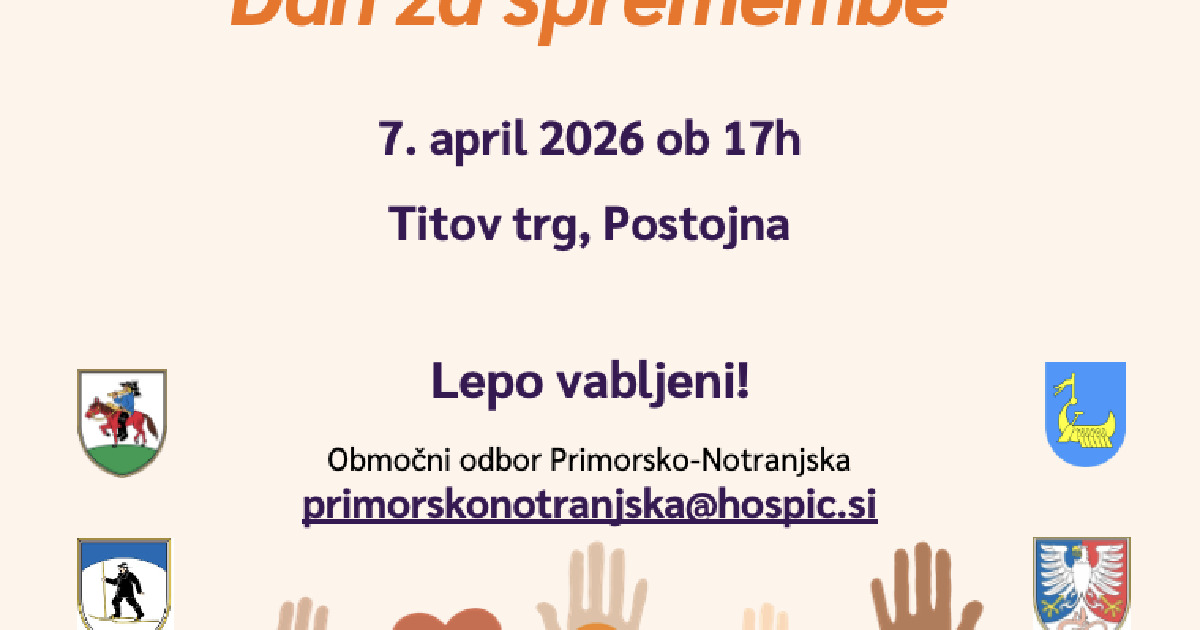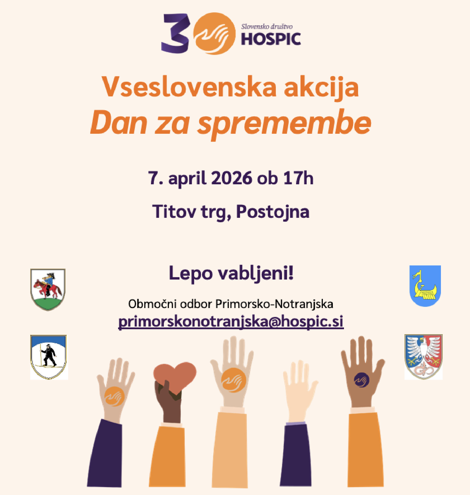 Letos poteka že 17. prostovoljska akcija Dan za spremembe, s katero vsi skupaj pokažemo na prispevek prostovoljstva pri grajenju bolj odpornih in povezanih skupnosti. Spoznajte naše društvo, listka Timija ter ustvarjajte z nami na “delavnici spominov”. Primerno za otroke in odrasle. Lepo vabljeni! Slovensko društvo Hospic Območni odbor Primorsko-Notranjska