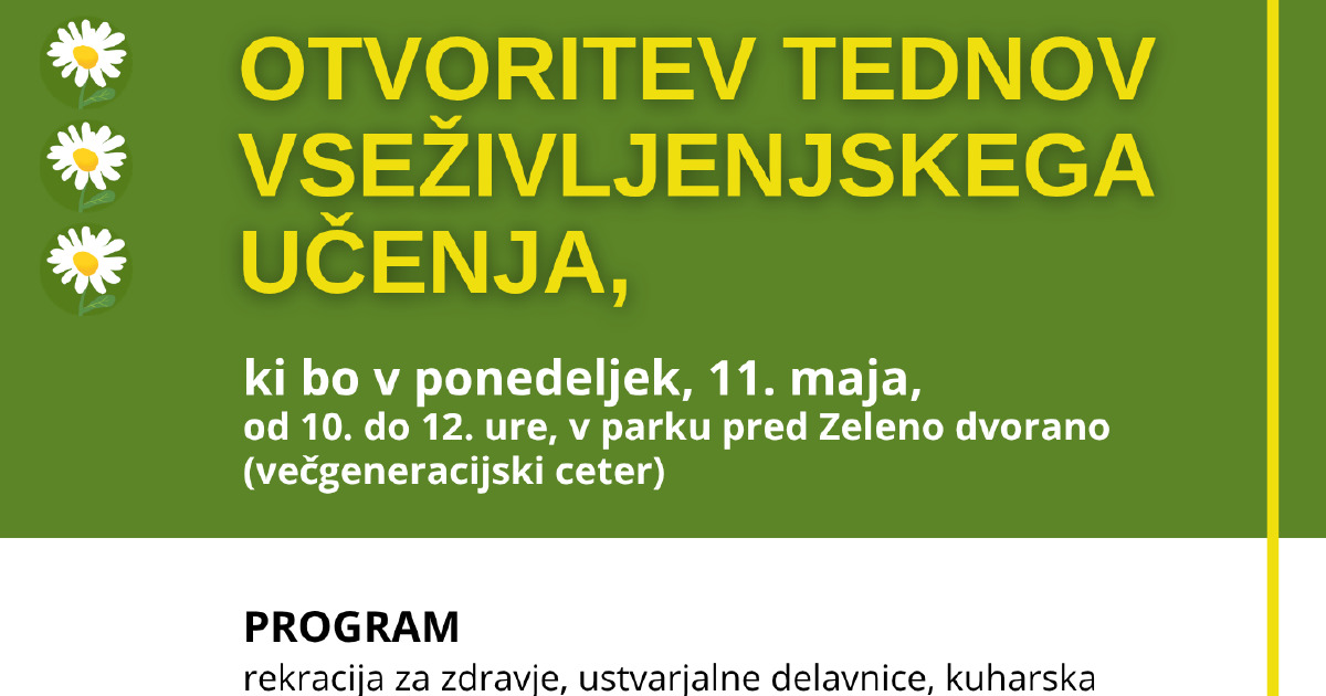 Vabimo vas na otvoritev tednov vseživljenskega učenja. Za vas smo pripravili ustvarjalne delavnice, kuharsko postojanko, delavnico joge..