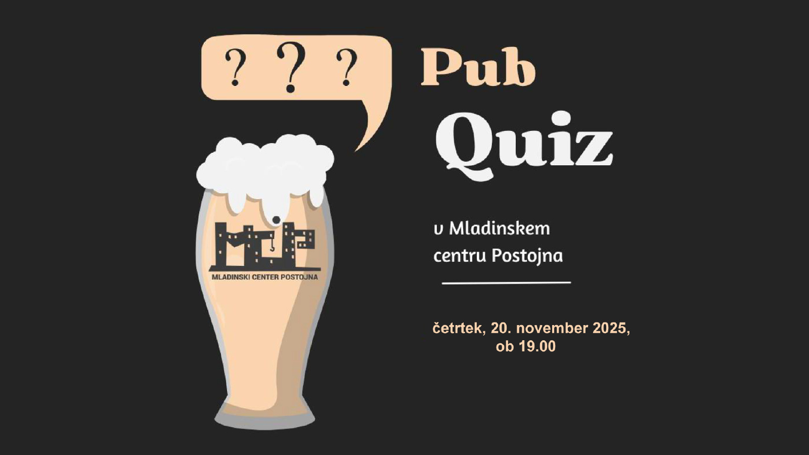 Vabljeni na že sedmo ponovitev simpatičnega kviza, kjer se skupine z od 2 do 4 člani merijo v znanju v najrazličnejših kategorijah, obenem pa zelo zabavajo. Prijave zbiramo na https://www.pubkviz.org/quizs/14/prijava.